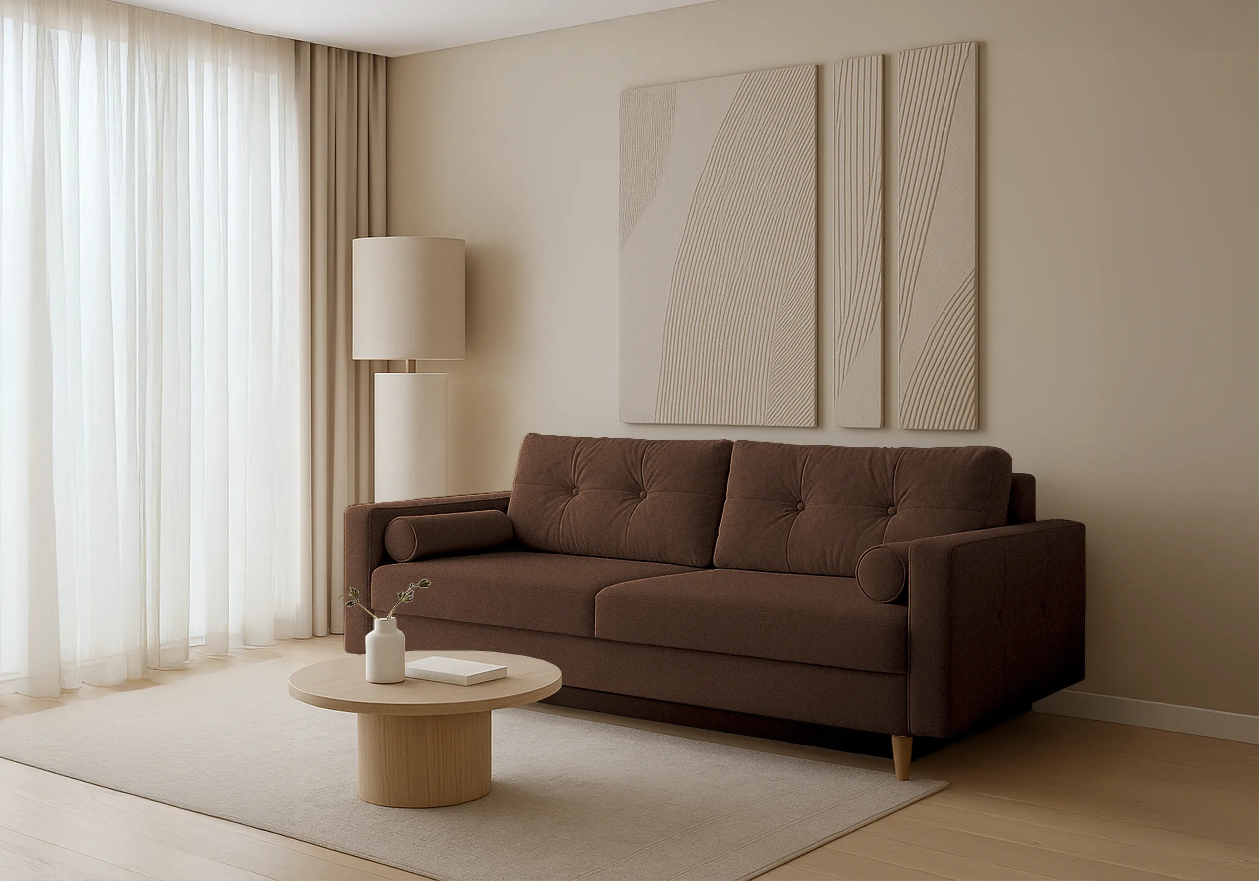 Pohovka Pastella • Vlastnosti: Materiál Kostra pohovky je vyrobena z masivního dřeva a dřevotřískových desek. Výplň sedáku a opěradla Na výplň jsou použity bonell pružiny, které jsou doplněny o pěnu T30. Nožičky Pohovka stojí na dřevěných nožičkách. Čalouněná záda Díky čalouněným zádům můžete pohovku umístit i do prostoru. • Úložný prostorPohovka Pastella je vybavena praktickým úložným prostorem umístěným pod sedákem. Tento úložný prostor je snadno přístupný a nabízí dostatek místa pro uschování polštářů, přikrývek a dalších předmětů, které si přejete mít pohodlně po ruce. • Rozklad na lůžkoPřeměna pohovky na lůžko je velice snadná. Po otevření úložného prostoru stačí sklopit záda. Vytvoří se vám ložná spací plocha pro příležitostné přespání. • Rozměry pohovky 213 cm celková šířka 83 cm celková výška 98 cm celková hloubka 153 x 189 cm spací plocha • Potahová látka QueensQUEENS je moderní čalouněný materiál, který se vyznačuje mimořádnou jemností. Jeho povrch je příjemný, hladký a jemný na dotek. Tento materiál splňuje přísná evropská nařízení ohledně škodlivých chemických látek (REACH).Materiál QUEENS je certifikován dle standardu Oeko-Tex, který garantuje vysokou kvalitu výrobků a zajišťuje, že neobsahují žádné škodlivé látky pro člověka. Tento certifikát je uznávanou bezpečnostní značkou pro textilní výrobky.Tkanina je vyrobena speciální technologií, která omezuje absorpci kapalin. Pokud se na ni rozlije tekutina, kapky se hromadí na povrchu látky. Zašpiněné místo lze jednoduše otřít hadříkem. • UpozorněníLátky prezentované na fotografiích jsou ilustračním materiálem, barvy se mohou lišit od vyobrazení na fotografiích podle nastavení vašeho zobrazovacího zařízení.