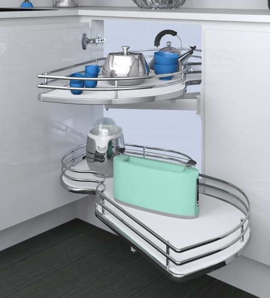 Combis 2 je patentovaný systém do rohových skříněk, takzvaný „slepý roh“. Jedná se o revoluční systém, velkou předností je jeho rychlá a snadná montáž, namontuje za pomocí vrtací šablony, která je součástí každého balení. Celková doba montáže nepřesáhne 5 minut a vzhledem k intuitivnímu řešení zvládne montáž i koncový zákazník. Systém lze použít jak do nových, tak již do existujících korpusů a nahradit tak dosavadní, nevyhovující, řešení. Vzhledem k tomu, že systém nevyužívá centrální rozpěrnou tyč, je umístění a počet jednotlivých košů libovolný. Přídavný tlumič není součást balení, v případě potřeby se jednoduše „nacvakne“ k systému. Ke každému koši je třeba zakoupit jeden přídavný tlumič = 2ks tlumiče pro jednu sadu. Systém COMBI‘S je certifi kován společností Catas na 50.000 cyklů, maximální zatížení jednoho koše je 20 kg, respektive 40 kg Specifikace:- Vícevrstvá police z melaminu- Povrchová úprava chrom/bílá nebo titan/antracit- Oválný drát 10 x 4 mm- Provedení: L (levostranné otevírání dvířek) nebo P (pravostranné otevírání dvířek)- Nosnost 1 police: 20 kg (celkem 40 kg).Sada obsahuje:- 2 ramena- 2 rohové police (ledvinky)- 1 šablonu pro předvrtání děr- možnost doobjednání přídavného tlumiče (nutno 2 kusy pro jednu sadu)