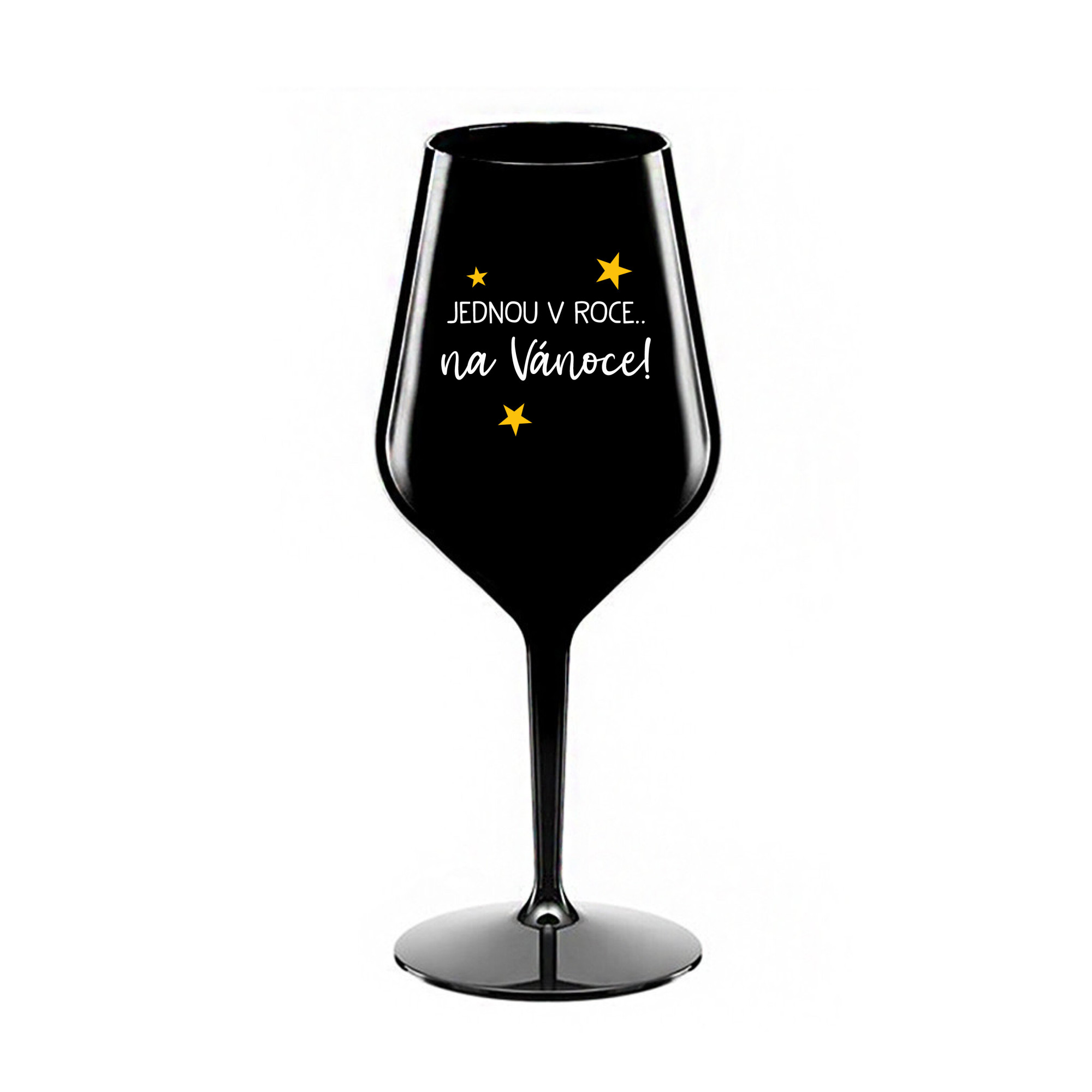 Nerozbitná černá vinná sklenice s motivem JEDNOU V ROCE NA VÁNOCE je skvělá na zahradu, pláž, výlet, piknik a parádu udělá i při kempování. Jelikož je vyrobená z kvalitního polykarbonátu je de facto nerozbitná. Je to luxusní kousek, s nímž si víno můžete vychutnat prostě kdekoliv. Mají ergonomický tvar, který příjemně padne do ruky a protože je lehká, usnadňuje to její přenášení. Je snadno skladovatelná a lehce se čistí. Díky svému designu si s ní můžete vychutnat doopravdy kdekoliv bezproblémové pití výborného vína. Materiál PP. Vyrobené s láskou v ČR