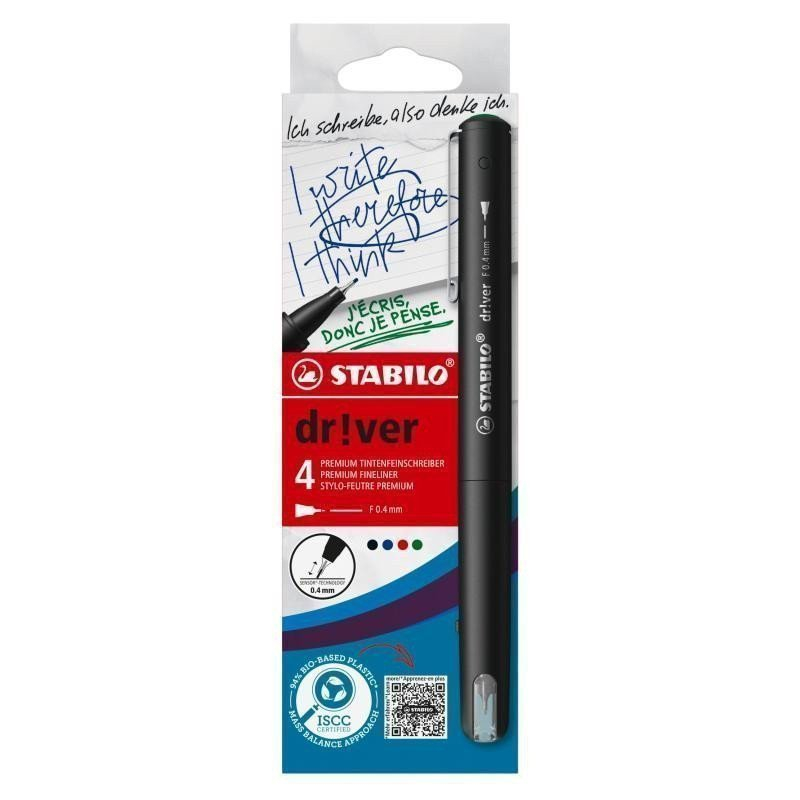 Prémiový jemný liner STABILO dr!ver je dokonalým doplňkem pro všechny příležitosti psaní. Ať už v kanceláři, ve třídě nebo doma – jemný liner je nadčasový, jednoduchý a velmi spolehlivý psací nástroj. Tenký hrot s šířkou stopy 0,4 mm je opatřen pružinou pro hladké a snadné psaní. Moderní černý designový liner má také kovový klip, který umožňuje jeho připevnění k tašce nebo notebooku. V sadě se čtyřmi barvami (červenou, zelenou, modrou a černou) je vynikající volbou pro delší čas strávený psaním nebo kreslením.