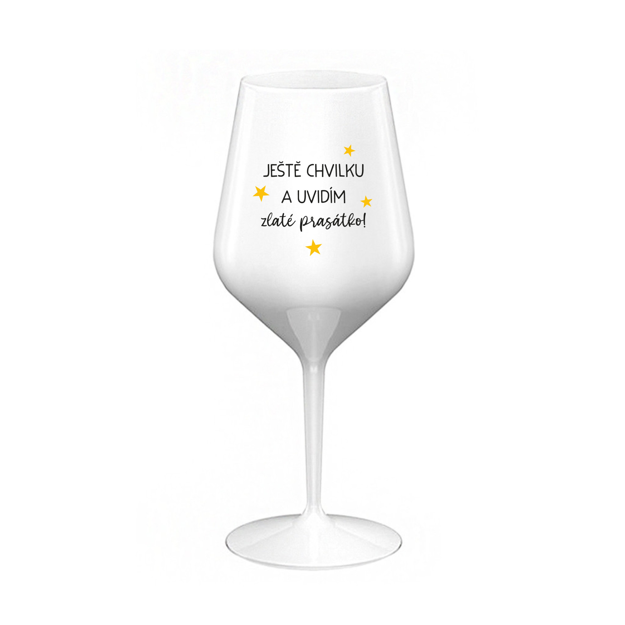 Nerozbitná bílá vinná sklenice s motivem JEŠTĚ CHVILKU A UVIDÍM ZLATÉ PRASÁTKO je skvělá na zahradu, pláž, výlet, piknik a parádu udělá i při kempování. Jelikož je vyrobená z kvalitního polykarbonátu je de facto nerozbitná. Je to luxusní kousek, s nímž si víno můžete vychutnat prostě kdekoliv. Mají ergonomický tvar, který příjemně padne do ruky a protože je lehká, usnadňuje to její přenášení. Je snadno skladovatelná a lehce se čistí. Díky svému designu si s ní můžete vychutnat doopravdy kdekoliv bezproblémové pití výborného vína. Materiál PP. Vyrobené s láskou v ČR