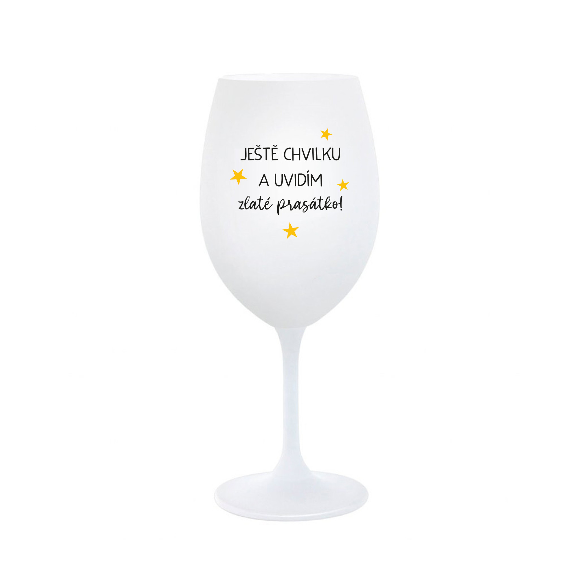 Vinná bílá sklenice s originálním motivem JEŠTĚ CHVILKU A UVIDÍM ZLATÉ PRASÁTKO je krásným a osobitým dárkem, které ale využijete i Vy sami třeba ve chvílích, kdy si budete chtít zpříjemnit náročný den. Tyto originální vinné sklenice jsou totiž nejen pro výjimečné události, ale i pro běžné večery, které si chcete zpříjemnit sklenkou dobrého vína. Jistě proto potěší každého milovníka vína, i toho, kdo si umí svůj život vychutnat plnými doušky. Materiál sklo. Vyrobené s láskou v ČR