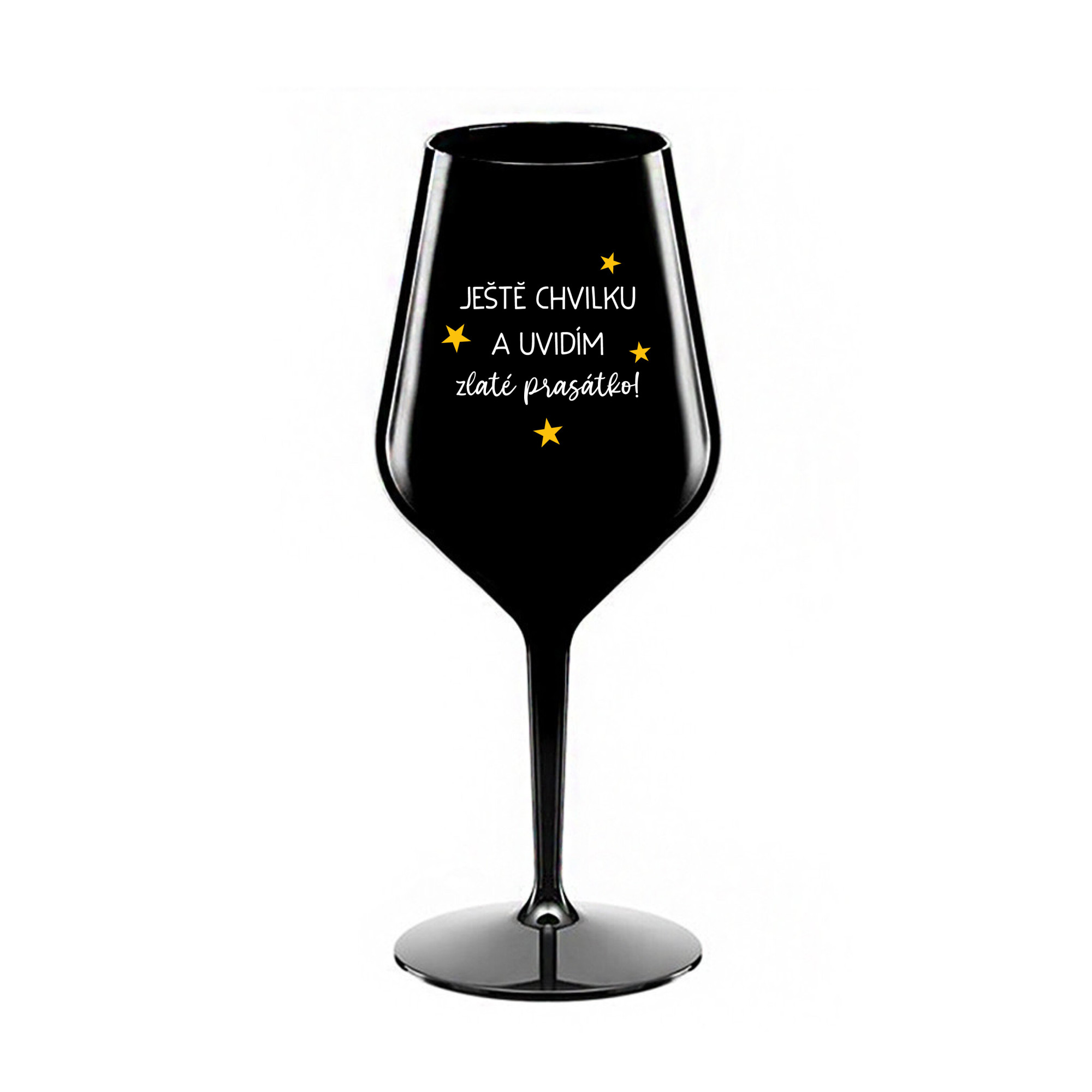 Nerozbitná černá vinná sklenice s motivem JEŠTĚ CHVILKU A UVIDÍM ZLATÉ PRASÁTKO je skvělá na zahradu, pláž, výlet, piknik a parádu udělá i při kempování. Jelikož je vyrobená z kvalitního polykarbonátu je de facto nerozbitná. Je to luxusní kousek, s nímž si víno můžete vychutnat prostě kdekoliv. Mají ergonomický tvar, který příjemně padne do ruky a protože je lehká, usnadňuje to její přenášení. Je snadno skladovatelná a lehce se čistí. Díky svému designu si s ní můžete vychutnat doopravdy kdekoliv bezproblémové pití výborného vína. Materiál PP. Vyrobené s láskou v ČR