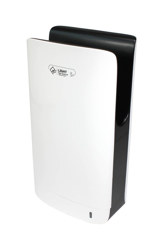 Jet Dryer LIGHT představuje elegantní sušení rukou v ultra malém rozměru. Tryskový vysoušeč je vhodný především do umýváren limitovaných prostorem. Vysoušeč rukou LIGHT  je vybaven HEPA filtrem. Voda, která se při vysoušení neodpaří, je zachytávána v odkapové nádobce. Ultra malé rozměry tryskového vysoušečeLIGHT je jedním z nejmenších tryskových vysoušečů z řady Jet Dryer. Výška přístroje je pouhých 55,6 cm, šířka 29,6 cm. Vysoušeč je vhodný především do malých koupelen.Jak tryskový vysoušeč Jet Dryer LIGHT funguje?Komfortní a rychlé osoušení rukou pomocí soustředěného proudu vzduchu. Použití bezkontaktního vysoušeče Jet Dryer LIGHT je velmi jednoduché. Po vložení rukou do sušící zóny se přístroj automaticky spustí. Po osušení vytáhnete ruce ven a přístroj se automaticky vypne. Většina vody se při vysoušení odpaří, zbývající steče do záchytné nádoby.Úspora a snadná údržbaProvoz tryskového vysoušeče rukou Jet Dryer LIGHT je v porovnání s papírovými ubrousky výrazně úspornější. Ubydou vám také starosti s pravidelným vynášením košů přeplněných ubrousky. Vysoušeč stačí jednou za čas pouze utřít měkkou utěrkou.Hygienický provoz díky HEPA filtruSušení rukou je zcela bezkontaktní, díky čemuž je zamezeno křížové kontaminaci bakteriemi a viry. Vzduch nasávaný vysoušečem je postupně filtrován pomocí HEPA filtru. Z vysoušeče tak proudí maximálně čistý a nezávadný vzduch. Do odkapové nádobky vysoušeče je možné nalít dezinfekční přísadu, která zároveň příjemně osvěží a provoní vzduch na toaletách.LED indikace stavu a osvětlení sušící zónySušící zóna je osvětlena pomocí LED diod. V přední straně vysoušeče se nachází led dioda skrytá pod podlouhlým průzorem. Modrá barva podsvícení signalizuje, že je vysoušeč připravený k použití. Automatický ohřev vzduchuOhřev není nutno zapínat, funguje automaticky podle okolní teploty. Vnitřní čidlo zapíná ohřev až do teploty okolí cca 23ºC. Poté vysoušeč ohřev nepoužívá, výstupní teplota je dostatečně komfortní pro běžné používání. Nucený ohřev doporučujeme zapínat pouze ve specifických případech.