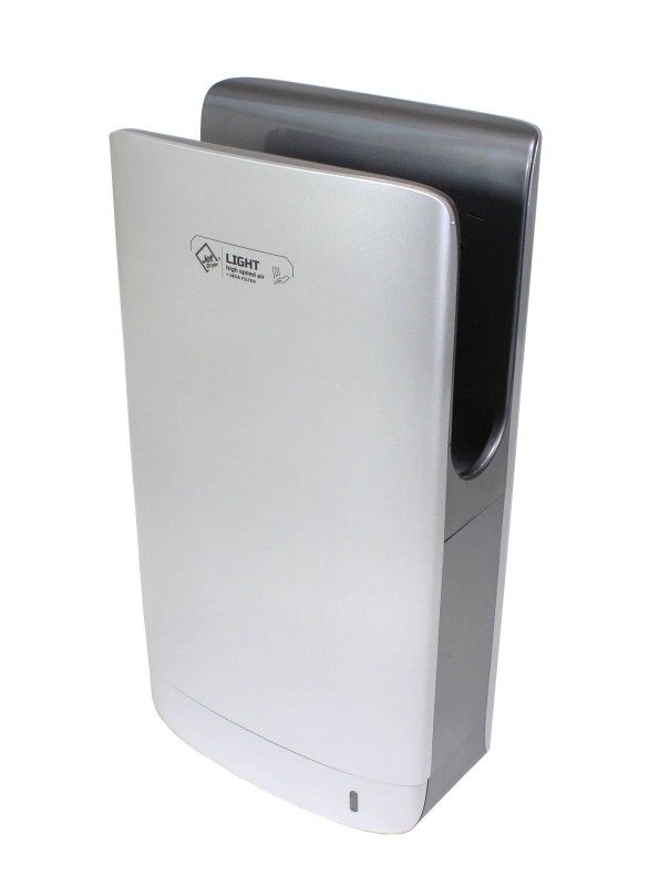 Jet Dryer LIGHT představuje elegantní sušení rukou v ultra malém rozměru. Tryskový vysoušeč je vhodný především do umýváren limitovaných prostorem. Vysoušeč rukou LIGHT je vybaven HEPA filtrem. Voda, která se při vysoušení neodpaří, je zachytávána v odkapové nádobce. Ultra malé rozměry tryskového vysoušečeLIGHT je jedním z nejmenších tryskových vysoušečů z řady Jet Dryer. Výška přístroje je pouhých 55,6 cm, šířka 29,6 cm. Vysoušeč je vhodný především do malých koupelen.Jak tryskový vysoušeč Jet Dryer LIGHT funguje?Komfortní a rychlé osoušení rukou pomocí soustředěného proudu vzduchu. Použití bezkontaktního vysoušeče Jet Dryer LIGHT je velmi jednoduché. Po vložení rukou do sušící zóny se přístroj automaticky spustí. Po osušení vytáhnete ruce ven a přístroj se automaticky vypne. Většina vody se při vysoušení odpaří, zbývající steče do záchytné nádoby.Úspora a snadná údržbaProvoz tryskového vysoušeče rukou Jet Dryer LIGHT je v porovnání s papírovými ubrousky výrazně úspornější. Ubydou vám také starosti s pravidelným vynášením košů přeplněných ubrousky. Vysoušeč stačí jednou za čas pouze utřít měkkou utěrkou.Hygienický provoz díky HEPA filtruSušení rukou je zcela bezkontaktní, díky čemuž je zamezeno křížové kontaminaci bakteriemi a viry. Vzduch nasávaný vysoušečem je postupně filtrován pomocí HEPA filtru. Z vysoušeče tak proudí maximálně čistý a nezávadný vzduch. Do odkapové nádobky vysoušeče je možné nalít dezinfekční přísadu, která zároveň příjemně osvěží a provoní vzduch na toaletách.LED indikace stavu a osvětlení sušící zónySušící zóna je osvětlena pomocí LED diod. V přední straně vysoušeče se nachází led dioda skrytá pod podlouhlým průzorem. Modrá barva podsvícení signalizuje, že je vysoušeč připravený k použití. Automatický ohřev vzduchuOhřev není nutno zapínat, funguje automaticky podle okolní teploty. Vnitřní čidlo zapíná ohřev až do teploty okolí cca 23ºC. Poté vysoušeč ohřev nepoužívá, výstupní teplota je dostatečně komfortní pro běžné používání. Nucený ohřev doporučujeme zapínat pouze ve specifických případech.