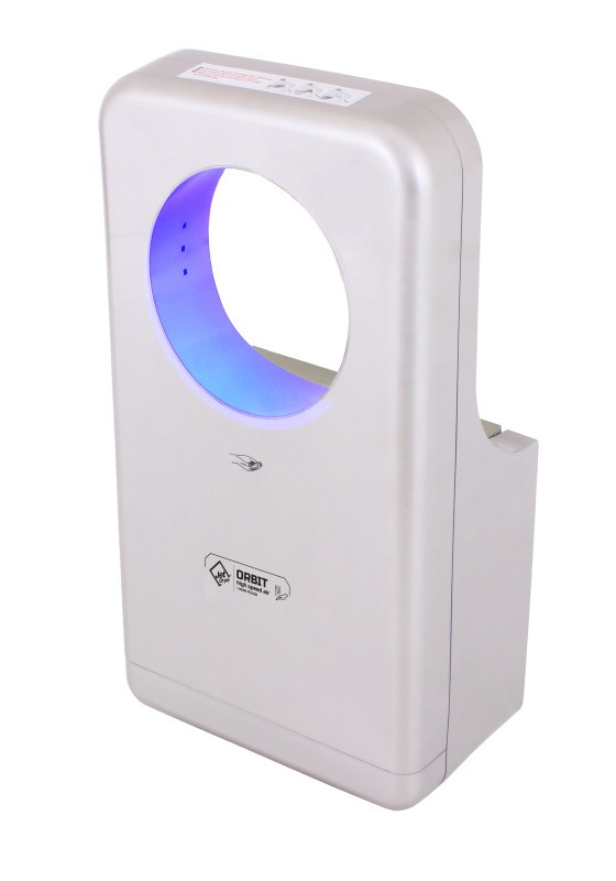 Kruhový design, absorpční kámen a možnost použití na toaletách pro hendikepované, dělají z Jet Dryer ORBIT naprosto jedinečný vysoušeč. Ruce jsou díky tornádo efektu suché do sedmi sekund. Díky tomu, že se instaluje výše, než ostatní tryskové vysoušeče, můžete jej dobře využít i na prostorově atypických umývárnách. Stejně jako ostatní vysoušeče, vám Jet Dryer ORBIT pomůže snížit provozní náklady, a navíc chráníte přírodu.Vysoušeč vhodný pro hendikepovanéORBIT je navržený pro použití na bezbariérových toaletách. Do většiny vysoušečů se ruce vkládají ze shora. To může být velmi limitující pro uživatele na invalidním vozíku. Do vysoušeče ORBIT se ruce vkládají z přední strany, takže je použití velmi snadné i pro hendikepované.Jedinečný kruhový design sušící zónyORBIT je jedinečný nejen svými funkcemi ale také vzhledem! Na trhu nenajdete jiný vysoušeč s kruhovým designem. Kruhový vysoušecí otvor je osvětlený LED diodami. Modré osvětlení působí futuristickým dojmem a vyzývá k vyzkoušení.Jak se Jet Dryer ORBIT používá?Do kruhové vysoušecí zóny stačí vložit ruce a postupovat podobně, jako při mytí rukou. Silné trysky rozmístěné uvnitř kruhu začnou okamžitě stírat a vysoušet vodu z rukou.  ORBIT dokonale vysuší ruce do 7 vteřin.Prachový a HEPA filtrJet Dryer ORBIT je vybaven kombinovaným výměnným filtrem. Nejdříve jsou filtrem hrubých nečistot zachyceny větší prachové částice. Tato část filtru je opatřena antibakteriální úpravou. Druhým stupněm filtrace je HEPA filtr, který zachytí většinu bakterii a virů.Vyberte si ze dvou barevJet Dryer Orbit je dostupný ve dvou atraktivních barvách. Můžete si vybrat z elegantní bílé nebo metalické stříbrné.Systém Dry Floor- keramický kámen, záchytná nádobaSpeciální porézní keramika zachytí velké množství vody a rychle vysychá. V případě většího vytížení vysoušeče je voda sbírána do spodní záchytné nádoby. Díky použití keramického kamene není nutné v méně frekventovaných provozech nádobku vůbec vylévat. Systém Dry Floor zajistí, že vaše podlaha bude vždy suchá a bez rizika uklouznutí.Tornádo efektŠest trysek po stranách a dvě trysky v horní části vysoušeče vytvářejí silný proud vzduchu, který se točí ve spirále. Díky tomu je ORBIT účinnější než klasické lineární tryskové vysoušeče.3 rychlostní stupněSnadno si navolte rychlost proudu vzduchu hned ze tří rychlostí. Přepínání rychlostí stejně jako ohřevu vzduchu je umístěno pod okapovou nádobkou.Odolný krytTělo vysoušeče je vyrobeno z ABS plastu. Tento materiál je houževnatý a odolný. Údržba je snadná, vysoušeč stačí utřít vlhkým hadříkem s použitím obvyklého čisticího prostředku.Inteligentní ohřev vzduchuPro vyšší komfort se ohřev vzduchu spíná automaticky, pokud okolní teplota klesne pod 25°C. Ohřev můžete nastavit tak, aby byl neustále zapnutý.