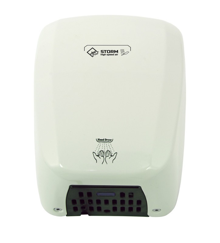 STORM představuje kombinaci kompaktních rozměrů horkovzdušných osoušečů se sušící silou tryskových vysoušečů. Robustní kovová konstrukce je vhodné i do vysoce frekventovaných míst. Osoušeč stačí naistalovat na zeď a zapomenout, žádné nákupy ubrousků, žádné přeplněné koše..Tryska ve tvaru ostří Proud teplého vzduchu vychází z osoušeče přes úzkou podlouhlou trysku. Tak je voda z rukou nejen vysoušena, ale také stírána. Vysoušení probíhá podobně jako u velkých tryskových vysoušečů.Vzduch je do Osoušeče nasáván ze spodní strany vysoušeče přes prachový filtr. Konstatní teplota po celou dobu vysoušeníNemusíte čekat dlouhé vteřiny, než se osoušeč nahřeje na plný výkon. Storm dosahuje provozní teploty prakticky ihned po vložení rukou.Snadná montážInstalace na zeď je prováděna pomocí čtyř šroubů. Případný servis nebo výměna filtru je rychlá a snadná. Zadní kryt vysoušeče stačí vycvaknout, nemusíte nic šroubovat.Antivandal úprava (v kovové úpravě)Kovový kryt vysoušeče je vyroben z jednoho kusu. 2 milimetry silný plech odolá každému vandalovi. Povrchová úprava umožňuje snadnou údržbu, osoušeč stačí utřít vlhkou utěrkou. Kryt je odolný proti poškození nešikovně odloženou cigaretou.