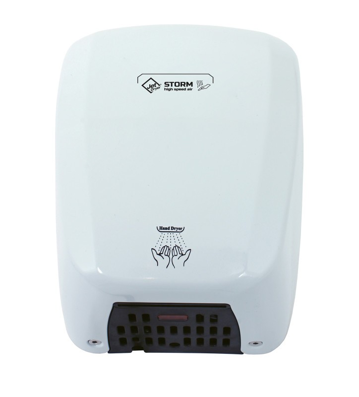 STORM představuje kombinaci kompaktních rozměrů horkovzdušných osoušečů se sušící silou tryskových vysoušečů. Robustní kovová konstrukce je vhodné i do vysoce frekventovaných míst. Osoušeč stačí naistalovat na zeď a zapomenout, žádné nákupy ubrousků, žádné přeplněné koše..Tryska ve tvaru ostří Proud teplého vzduchu vychází z osoušeče přes úzkou podlouhlou trysku. Tak je voda z rukou nejen vysoušena, ale také stírána. Vysoušení probíhá podobně jako u velkých tryskových vysoušečů.Vzduch je do Osoušeče nasáván ze spodní strany vysoušeče přes prachový filtr. Konstatní teplota po celou dobu vysoušeníNemusíte čekat dlouhé vteřiny, než se osoušeč nahřeje na plný výkon. Storm dosahuje provozní teploty prakticky ihned po vložení rukou.Snadná montážInstalace na zeď je prováděna pomocí čtyř šroubů. Případný servis nebo výměna filtru je rychlá a snadná. Zadní kryt vysoušeče stačí vycvaknout, nemusíte nic šroubovat.Antivandal úprava (v kovové úpravě)Kovový kryt vysoušeče je vyroben z jednoho kusu. 2 milimetry silný plech odolá každému vandalovi. Povrchová úprava umožňuje snadnou údržbu, osoušeč stačí utřít vlhkou utěrkou. Kryt je odolný proti poškození nešikovně odloženou cigaretou.