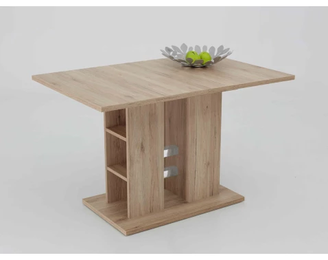 Rozkládací funkci desky doplňují nápadité odkládací přihrádky ve spodní části konstrukce. Celý stůl je vyroben v dekoru dub San Remo.