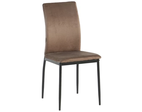 Klasická jídelní židle na černých kovových nohách je stabilní a sedák má očalouněn sametově hebkou látkou v barvě hnědá.