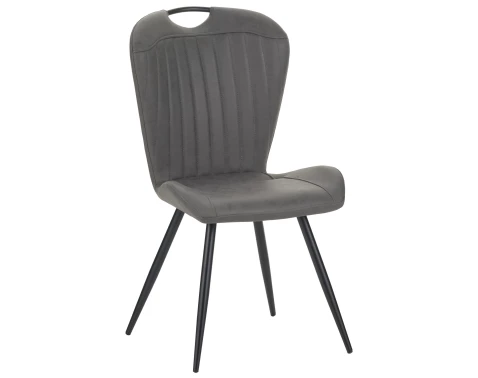 Moderní jídelní židle na černých kovových nohách má pohodlný tvar a působí stylově díky šedé látce ve vintage optice broušené kůže a okrasnému prošívání.