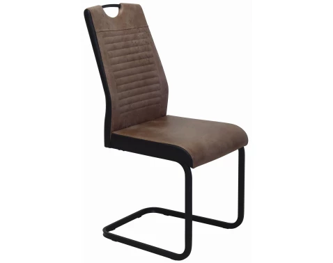 Jídelní židle na kovové podnoži má horizontálně prošitý opěrák a zajímavě řešený potah v kombinaci černé ekokůže a látky v optice lesklé kůže.