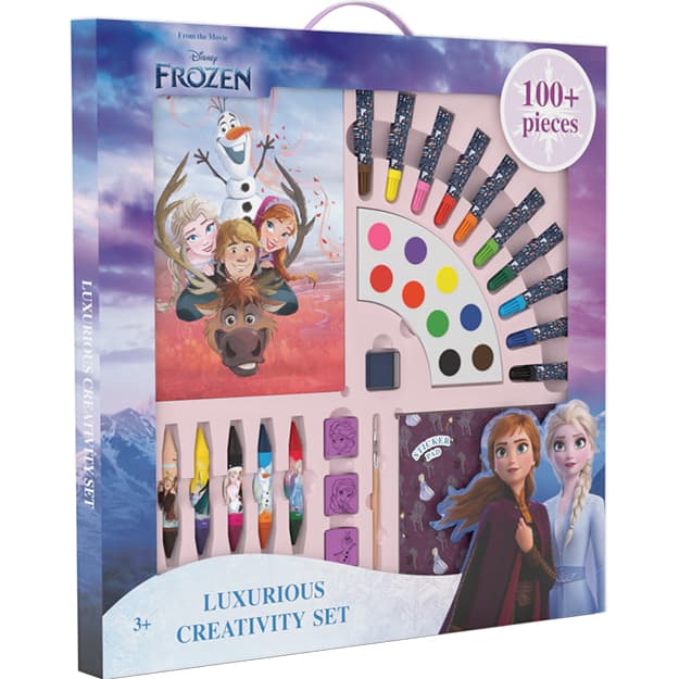 Anna, Elsa, Olaf, Kristoff a další postavy z oblíbeného animáku, v báječné kreativní sadě pro malé i větší výtvarníky. Tento výjimečný set je ideální pro všechny malé princezny a umělce, kteří milují tvoření a kouzlo Arendelle. Set obsahuje bohatou škálu kreativních nástrojů, včetně samolepek, pastelek a dalších výtvarných doplňků, díky kterým si děti mohou vytvořit své vlastní pohádkové dílo inspirované Elsou, Annou a jejich přáteli. Díky kompaktnímu balení se také výborně hodí na cesty. Sada obsahuje 100+ ks výtvarných potřeb. 10x popisovač (fixa) 5x oboustranný olejový pastel (voskovka) 1x vodovky s devíti barvami 3x pěnové razítko 1x razítkovací poduška s inkoustem 1x sešit s omalovánkami 1x sešit se samolepkami 1x štětec 3x obrázek k vystřižení