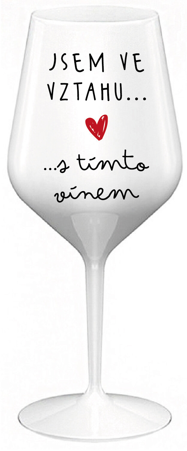 Nerozbitná bílá vinná sklenice s motivem JSEM VE VZTAHU S TÍMTO VÍNEM je skvělá na zahradu, pláž, výlet, piknik a parádu udělá i při kempování. Jelikož je vyrobená z kvalitního polykarbonátu je de facto nerozbitná. Je to luxusní kousek, s nímž si víno můžete vychutnat prostě kdekoliv. Mají ergonomický tvar, který příjemně padne do ruky a protože je lehká, usnadňuje to její přenášení. Je snadno skladovatelná a lehce se čistí. Díky svému designu si s ní můžete vychutnat doopravdy kdekoliv bezproblémové pití výborného vína. Materiál PP. Vyrobené s láskou v ČR