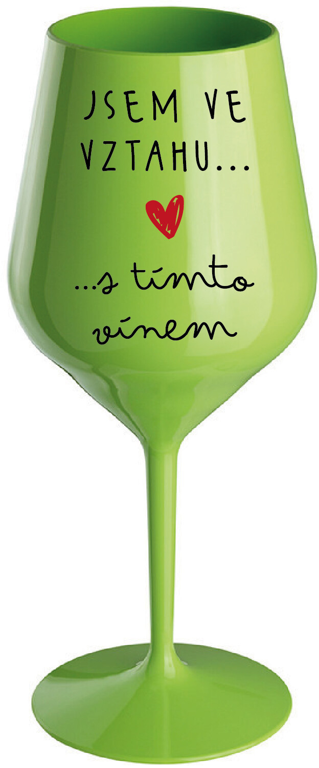 Nerozbitná zelená vinná sklenice s motivem JSEM VE VZTAHU S TÍMTO VÍNEM je skvělá na zahradu, pláž, výlet, piknik a parádu udělá i při kempování. Jelikož je vyrobená z kvalitního polykarbonátu je de facto nerozbitná. Je to luxusní kousek, s nímž si víno můžete vychutnat prostě kdekoliv. Mají ergonomický tvar, který příjemně padne do ruky a protože je lehká, usnadňuje to její přenášení. Je snadno skladovatelná a lehce se čistí. Díky svému designu si s ní můžete vychutnat doopravdy kdekoliv bezproblémové pití výborného vína. Materiál PP. Vyrobené s láskou v ČR
