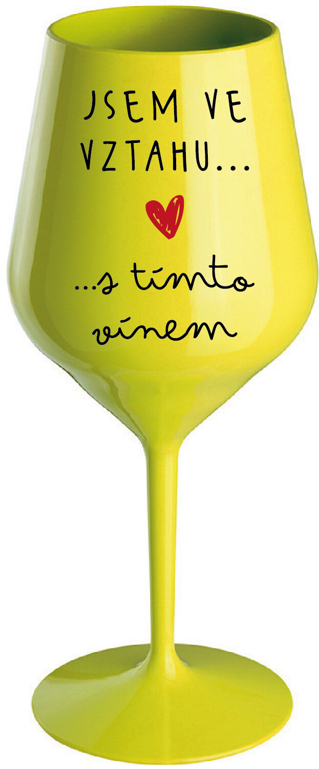 Nerozbitná žlutá vinná sklenice s motivem JSEM VE VZTAHU S TÍMTO VÍNEM je skvělá na zahradu, pláž, výlet, piknik a parádu udělá i při kempování. Jelikož je vyrobená z kvalitního polykarbonátu je de facto nerozbitná. Je to luxusní kousek, s nímž si víno můžete vychutnat prostě kdekoliv. Mají ergonomický tvar, který příjemně padne do ruky a protože je lehká, usnadňuje to její přenášení. Je snadno skladovatelná a lehce se čistí. Díky svému designu si s ní můžete vychutnat doopravdy kdekoliv bezproblémové pití výborného vína. Materiál PP. Vyrobené s láskou v ČR