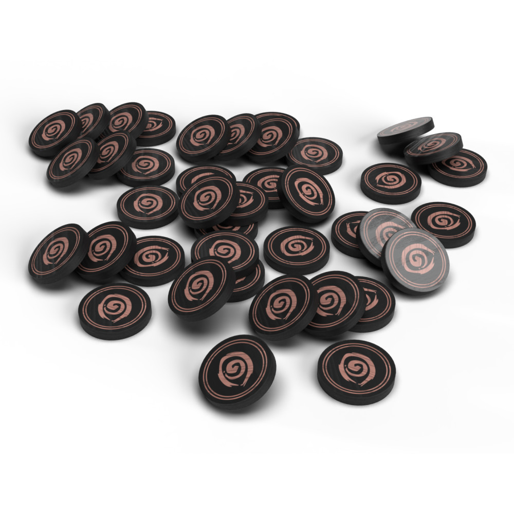 Dřevěné mince vlivu pro hru Kacíř: Zkáza Roanoke. Obsahuje 40 dřevěných mincí vlivu.