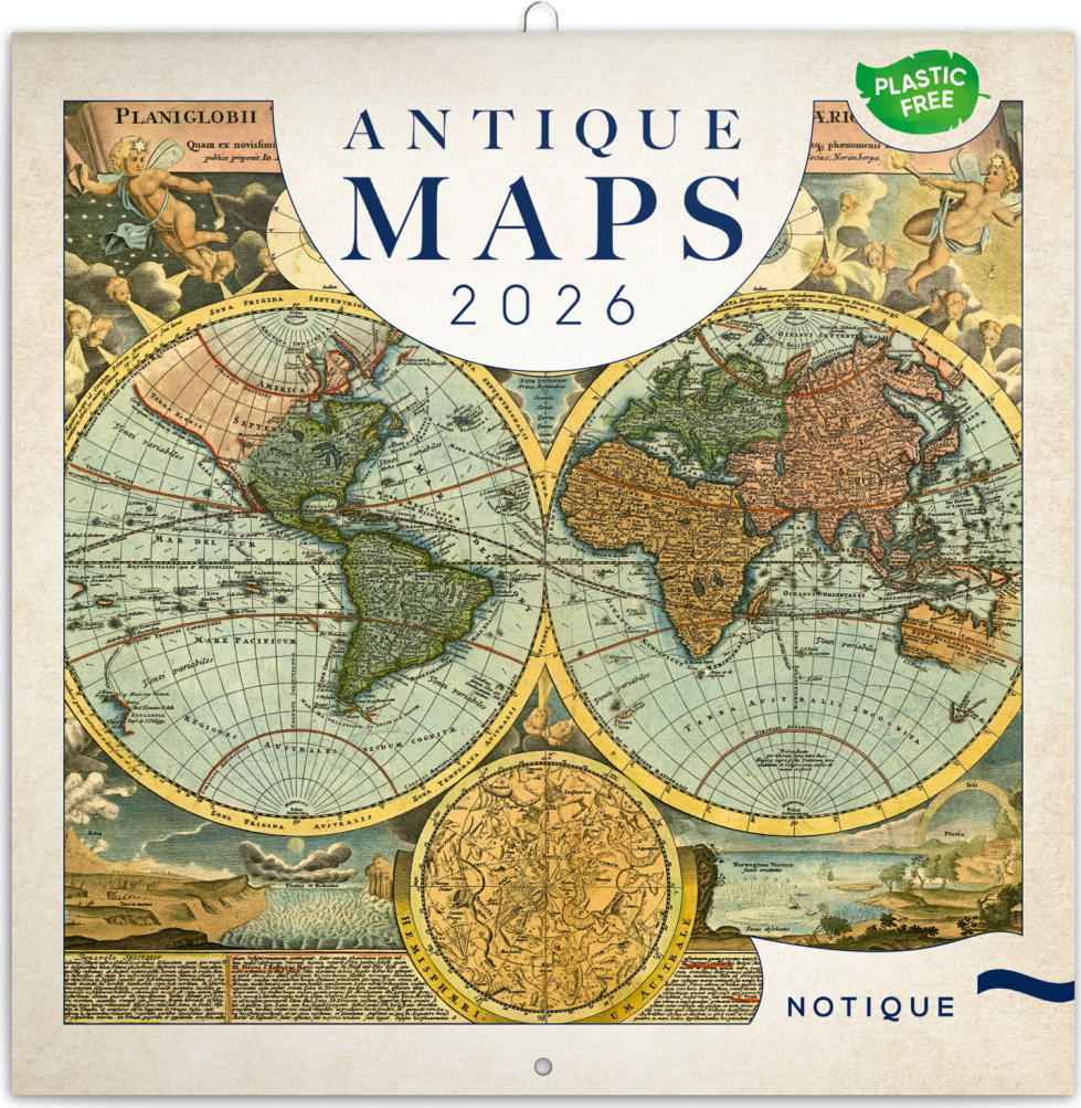 Dvanáct ilustrací starých map v praktickém poznámkovém kalendáři. Kalendář obsahuje přehledné kalendárium od září 2025 do prosince 2026 v osmi jazycích, měsíční fáze, důležité svátky a prostor pro poznámky na každý den. Kalendář je součástí kolekce Plastic Free, je zabalený v obálce z recyklovaného papíru a vytištěný na recyklovaném strukturovaném papíře s vysokou gramáží.