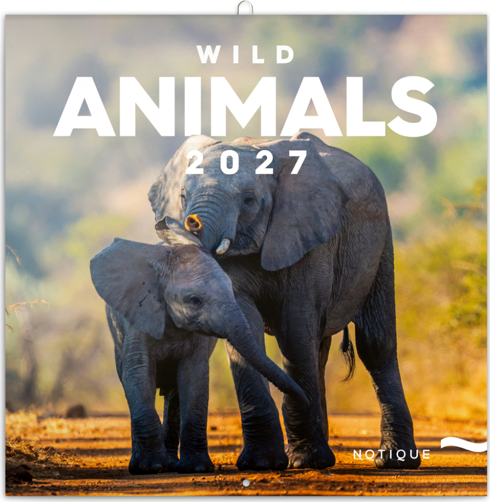 Dvanáct fotografií divokých zvířat v praktickém poznámkovém kalendáři. Kalendář obsahuje přehledné kalendárium od září 2026 do prosince 2027 v šesti jazycích, měsíční fáze, důležité svátky a prostor pro poznámky na každý den.