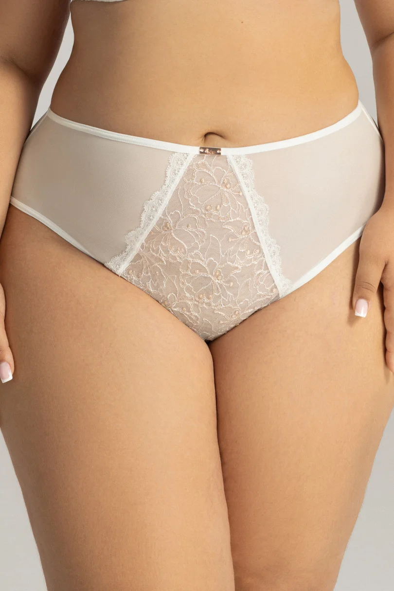 Odkryj elegancję i komfort w jednym – pełne figi w kolorze ecru to bielizna, która podkreśla kobiecość i zapewnia idealne dopasowanie. Przód majtek ozdobiony jest misterną, kwiatową koronką z delikatnym połyskiem i haftem, co nadaje całości wyjątkowego, luksusowego charakteru. Elastyczne boki i tył wykonane z miękkiej siateczki delikatnie opinają sylwetkę, zapewniając wygodę przez cały dzień. Subtelna kokardka z biżuteryjnym detalem dopełnia romantyczny styl. To idealna propozycja dla kobiet ceniących jakość i estetykę – bez kompromisów. Skład surowcowy: 91% Poliamid, 5% Bawełna, 4% Elastan