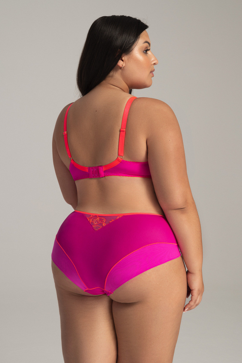 Plné kalhotky fuchsiové barvy s oranžovou výšivkou jsou spodním prádlem, které v sobě spojuje výjimečnou eleganci a každodenní pohodlí. Jsou vyrobeny z elastického tylu a měkkého mikrovlákna, dokonale se přizpůsobí postavě, modelují ji a zdůrazňují její přirozený tvar. Přední část kalhotek zdobí výrazná květinová výšivka v intenzivním oranžovém odstínu, která jim dodává ženský šarm a jemný charakter. Plný střih poskytuje pohodlí a pocit sebevědomí v každé situaci. Skvěle se hodí do kompletu s podprsenkou ze stejné řady. Složení kombinézy: 91 % polyamid, 5 % bavlna, 4 % elastan Složení kombinézy: 91 % polyamid, 5 % bavlna, 4 % elastan.