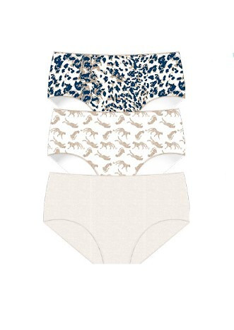Dámské kalhotky - plný, postavený střih - z vysoce kvalitní jemné bavlny - dva kusy zdobené zvířecím potiskem, třetí hladký - baleno po třech kusech - nohavice a pas jemně olemované tenkou gumičkou Složení: 95 % bavlna, 5 % elastan
