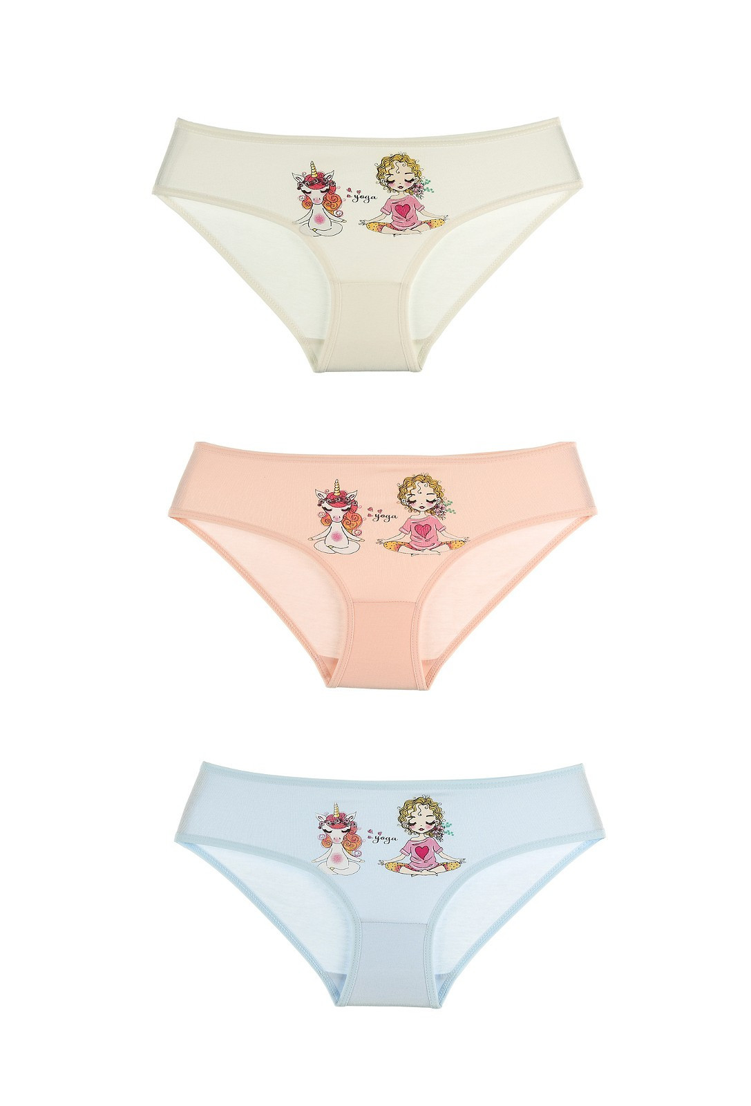 Dívčí bavlněné kalhotky - zdobené barevným potiskem - klasický střih - baleno po třech kusech v plastovém sáčku - barevné kombinace: ecru-modro-růžová; růžovo-žluto-fialová; modro-fialovo-růžová; ecru-žlutá, modrá Složení: 95% bavlna, 5% elastan