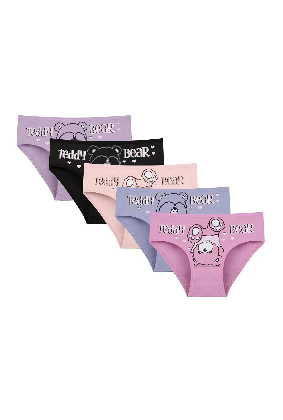 Dívčí bavlněné kalhotky - potisk medvídka na přední straně - baleno po třech kusech v plastovém sáčku v různých barevných kombinacích - dostupné barvy: růžová, fialová, vřesová, černá Složení: 95 % bavlna, 5 % elastan