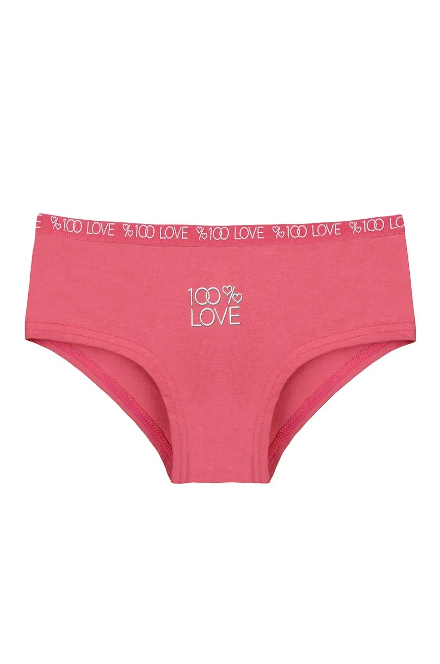 Bavlněné kalhotky pro dospívající dívky - ozdobná grafika na přední straně - širší elastický pás s nápisy - dostupné barvy: růžová, fialová, džínová, modrá, korálová - baleno po párech v polyethylenovém sáčku v různých barevných kombinacích Složení: 95 % bavlna, 5 % elastan