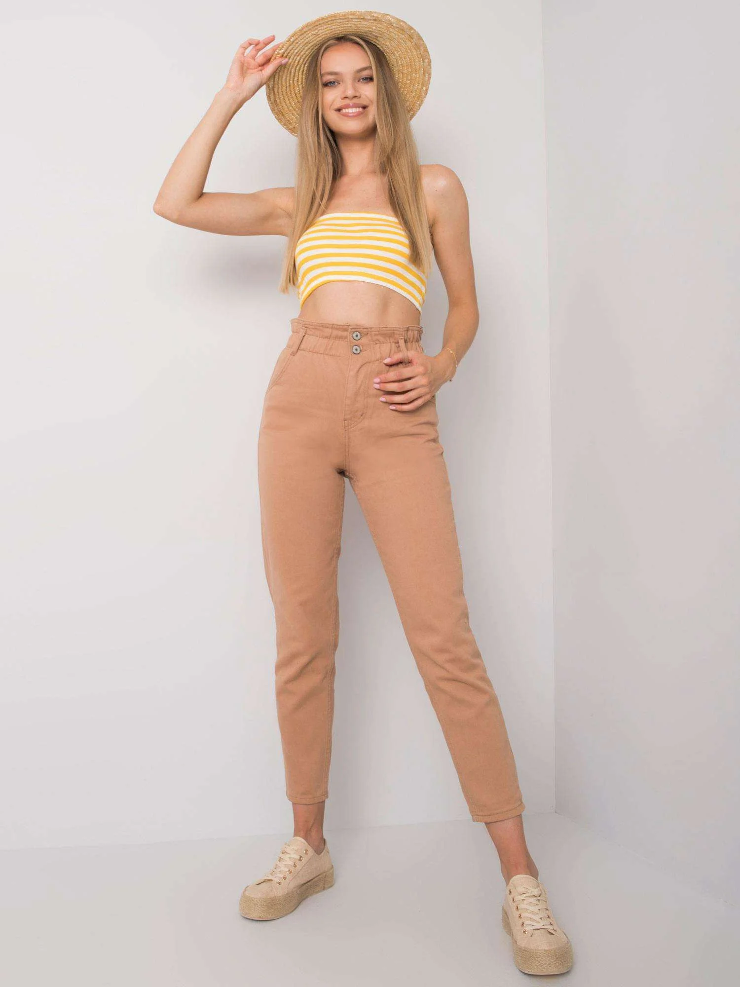 RUE PARIS Velbloudí kalhoty s vysokým pasem. složení látky: 100% bavlna způsob praní: praní v pračce na 30 °C Modelka má na sobě velikost 28. Rozměry modelky: výška 174 cm, prsa 82 cm, pas 62 cm, boky 89 cm. Kalhoty velikosti 26 měřeno na plocho: šířka v pase - 32 cm, délka - 91 cm, výška v pase - 29 cm Kalhoty velikosti 28 měřeno na plocho: šířka v pase - 35 cm, délka - 96 cm, výška v pase - 32 cm Mezinárodní velikostVelikost VýškaObvod pasuObvod bokůVnější délka nohaviceDélka vnitřní nohavice25XS34156-16466-7486847326S36160-16872-80888673.528M38162-17278-86928974.530L40164-17484-901009375.532XL42166-17888-961049776.5