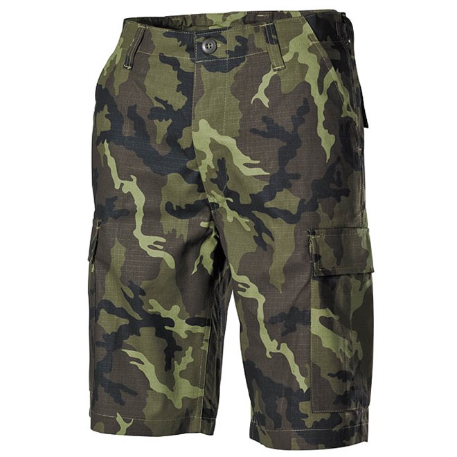 Kraťasy z lehké bavlny se zpevňující osnovou RipStop Kraťasy ve stylu klasických dlouhých kalhot polní bojové uniformy US ARMY (kalhoty US ARMY (BDU - Battle Dress Uniform). Jsou zhotoveny z lehké bavlny opatřené zpevňující osnovou RipStop, která brání šíření případných trhlin. Kalhoty mají dvě boční průhmatové kapsy se šikmými vstupy, dvě zadní kapsy kryté klopami a na bocích stehen vakové kapsy rovněž chráněné klopami. Klopy kapes jsou připínány knoflíky. Obvod v pase lze snadno upravit bočními stahovacími pásky. Ke kalhotám lze použít opasek do maximální šířky 55 mm. Zapínání poklopce je řešeno knoflíky. Kalhoty najdou uplatnění u příznivců kraťas zhotovených v military stylu, kterým v nabídce civilních modelů scházejí krátké kalhoty v oblíbené vojenské kamufláži. Materiál: 100 % bavlna, RipStop (s protizátrhovou osnovou) Hmotnost: 360 g (vel. L) Výrobce: MFH, Německo