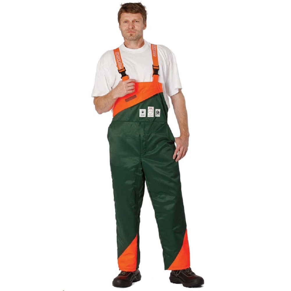 • Klasické kalhoty s náprsenkou vyrobené z nově modifikované používané tkaniny, mají zvýšený zadní pas s všitou gumou a postranní rozparek se zapínáním • Dvě přední kapsy jsou nyní nově v provedení bez vnějších švů, diagonálně tvarovanou kapsu se zipem na náprsence a dvě kapsy na pravé nohavici vzadu, z toho jednu na kombinovaný klíč • Kalhoty jsou opatřeny pružným klínkem v rozkroku a mají taktéž pružné široké šle v oranžovém provedení s pevně nastavitelnou zasouvací přezkou • Diagonální rozhraní tkaniny v oranžovém a zeleném probarvení, které se uplatňuje i v jedinečném umístění bezpečnostních oranžových klínů na levé straně nohavic, korespondujících tak dle normy s protipořezovým úpletem • Dle statistik právě v těchto místech dochází k nejčastějšímu kontaktu s RŘP. Kalhoty jsou v dolní části opatřeny protiklíšťatovou úpravou. • Úroveň ochrany 1, ochranná plocha A • použité materiály vyrobenz z: polyesteru, polyamidu, polypropylenu, bavlny • barva: zeleno-oranžová • Velikostní sortiment: 44 - 66 • ve výškových třídách 170, 182, 194 cm
