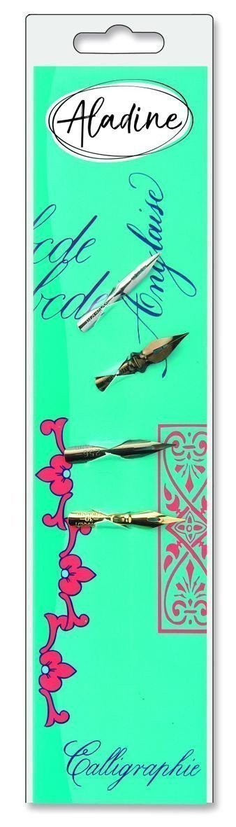 4 různá náhradní perka na anglickou kaligrafii. Každé z nich vyžaduje jiné používání a vytváří jiný efekt. Perko nasadíte do násadky (balení násadku neobsahuje). Tip:Namočte perko do inkoustu AladineKdyž se hrot rovnoměrně potáhne inkoustem, můžete začít psátPoužívejte vždy kvalitní papíry vyšší gramážeKaligrafická peraObjevte svět kaligrafie. Pomocí kaligrafických per dokážete vytvořit detailní umělecký nápis. Kaligrafické perko se seříznutým plochým hrotem zanechává širokou stopu při psaní v jednom směru a tenkou stopu v druhém směru. Pero se špičatým hrotem vytváří linku vlasovou, silnou čáru pak získáte přitlačením na hrot.Kaligrafie pochází z řeckého kallos „krása“ a grafos „psaní“) je umění krasopisu.Krasopis českého psacího písma pochází z 19. století, kdy bylo psací písmo upraveno pro češtinu z anglické latinky. Rada:Nové perko je pro lepší psaní třeba před prvním psaním otočit z obou stran a podržet nad plamenem cca. 1 vteřinu, aby se prohřál hrot a lak na povrchu.Inkoust pak lépe přilne.PopisVlastnostipočet v balení4 ks