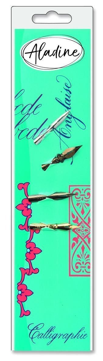 4 různá náhradní perka na anglickou kaligrafii. Každé z nich vyžaduje jiné používání a vytváří jiný efekt. Perko nasadíte do násadky (balení násadku neobsahuje). Tip: Namočte perko do inkoustu Aladine Když se hrot rovnoměrně potáhne inkoustem, můžete začít psát Používejte vždy kvalitní papíry vyšší gramáže Kaligrafická pera Objevte svět kaligrafie. Pomocí kaligrafických per dokážete vytvořit detailní umělecký nápis. Kaligrafické perko se seříznutým plochým hrotem zanechává širokou stopu při psaní v jednom směru a tenkou stopu v druhém směru. Pero se špičatým hrotem vytváří linku vlasovou, silnou čáru pak získáte přitlačením na hrot. Kaligrafie pochází z řeckého kallos „krása“ a grafos „psaní“) je umění krasopisu. Krasopis českého psacího písma pochází z 19. století, kdy bylo psací písmo upraveno pro češtinu z anglické latinky. Rada: Nové perko je pro lepší psaní třeba před prvním psaním otočit z obou stran a podržet nad plamenem cca. 1 vteřinu, aby se prohřál hrot a lak na povrchu. Inkoust pak lépe přilne. Popis Vlastnosti počet v balení4 ks