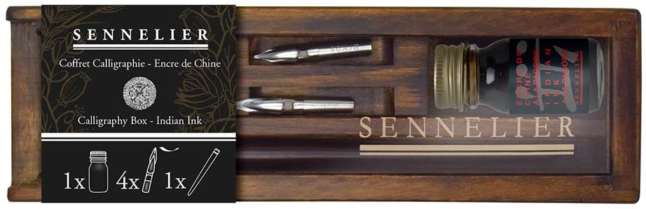 Kaligrafie neboli umění krasopisectví má hluboké kořeny v historii. Moderní kaligrafie se stala oblíbeným způsobem, jak vyjádřit krásu slov a písmen. Vtiskněte svým textům a dokumentům punc originality a ručního zpracování. Sada Sennelier obsahuje černý kaligrafický inkoust o objemu 10 ml. Inkoust je na bázi šelaku s přírodními pigmenty, po zaschnutí zanechává hedvábný povrch. Balení dále obsahuje 4 perka s různými hroty a dřevěnou lakovanou násadku. Sada je uložena ve vkusném dřevěném boxu, díky čemuž se hodí jako krásný dárek pro všechny milovníky krasopisu. Vyrobeno ve Francii.