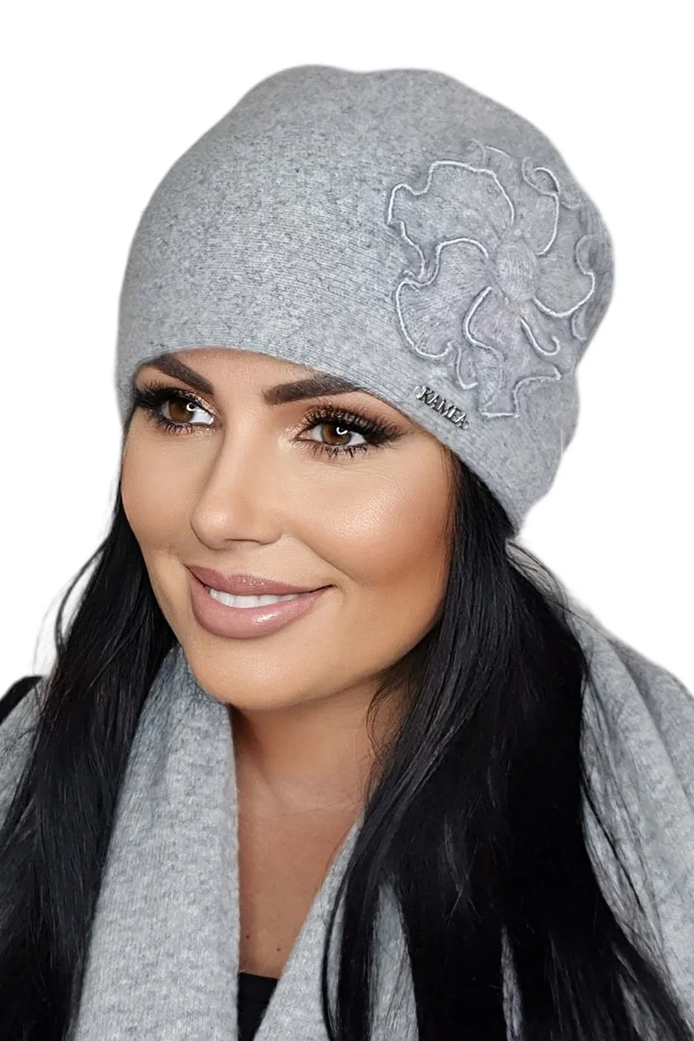 Dámská pokrývka hlavy značky Kamea, model Olimpia. Výrobek je vyroben z 80 % z vlny a 20 % z polyamidu.