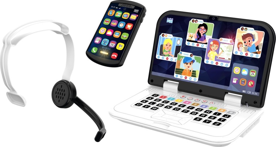 Podpořte kreativitu a fantazii svých dětí s kancelářskou sadou pro nejmenší! Tato zábavná sada obsahuje dětský počítač, sluchátka a telefon, díky kterým si děti mohou vyzkoušet, jaké to je být malým pracovníkem v kanceláři. Sada je navržena tak, aby byla bezpečná a snadno ovladatelná pro malé ručičky. Dětský počítač má tlačítka s interaktivními zvuky, sluchátka a telefon umožňují dětem napodobovat různé zvuky a komunikaci. Sada je skvělá pro rozvoj motorických dovedností, zlepšení koordinace a podporu představivosti. K bateriím 2× AAA (součástí balení) je sada připravena k použití hned po zakoupení! Ideální pro děti od 3 let, které si chtějí užívat hodiny zábavy při hraní na kancelářské pracovníky! První realistický set pro home office! Sada obsahuje dětský počítač, sluchátka a telefon. Počítač obsahuje 5 herních režimů – objevování, písmena, čísla, barvy a hru „buď jako“ Počítač má zvukový režim v CZ/SK verzi, telefon má zvukové efekty a hraje hudbu; sluchátka jsou bez elektronické funkce.