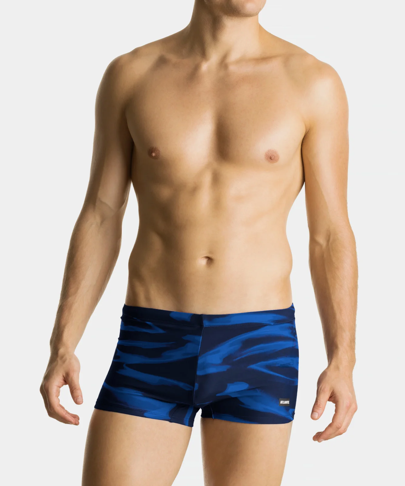 Kąpielówki szorty, Kolekcja Swimwear - SwimwearKąpielówki o oryginalnym nadruku wyglądającym niczym niebieskie i granatowe płomienie ozdobione są logo Atlantic na lewej nogawce. Kąpielówki szorty mają sportowy krój - ich nogawki są uniwersalnej długości, a średniej wysokości talia zaznaczona jest ściąganym, wewnętrznym sznurkiem. Wewnątrz znajduje się dodatkowa podszewka. Kąpielówki wykonane są z szybkoschnącego poliamidu z domieszką rozciągliwego elastanu. Dzianina z biegiem czasu nie traci kolorów, nie odkształca się i nie gniecie. Jest też odporna na działanie promieni słonecznych. granatowy, niebieskiGRANATOWY80% poliamid, 20% elastan