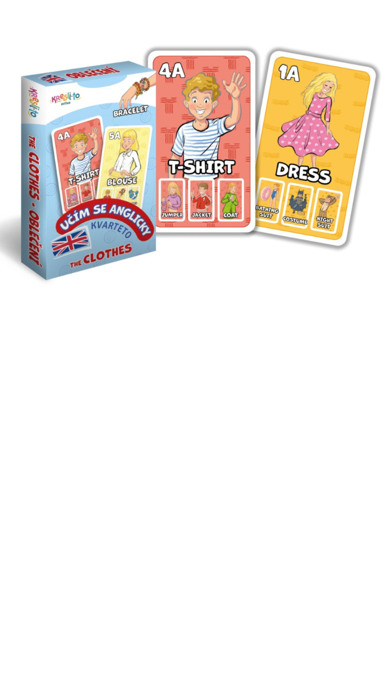 S populárním anglickým kvartetem si nejen zahraješ a užiješ spoustu zábavy s kamarády, či rodiči, babičkou, dědečkem, ale naučíš se a procvičíš si anglická slovíčka na téma oblečení a doplňky – od hlavy až po paty. Je tou pravou zábavou pro nudný večer nebo propršený den. Také vhodné jako dárek. Najdeš zde i kartu se slovníčkem a návodem, jak skládat otázky a odpovědi přímo v angličtině. Zahraj si doma, ale i ve škole. Hra podporuje samostatné učení zábavnou formou a motivaci k procvičení si anglických slovíček potřebných pro běžnou komunikaci.