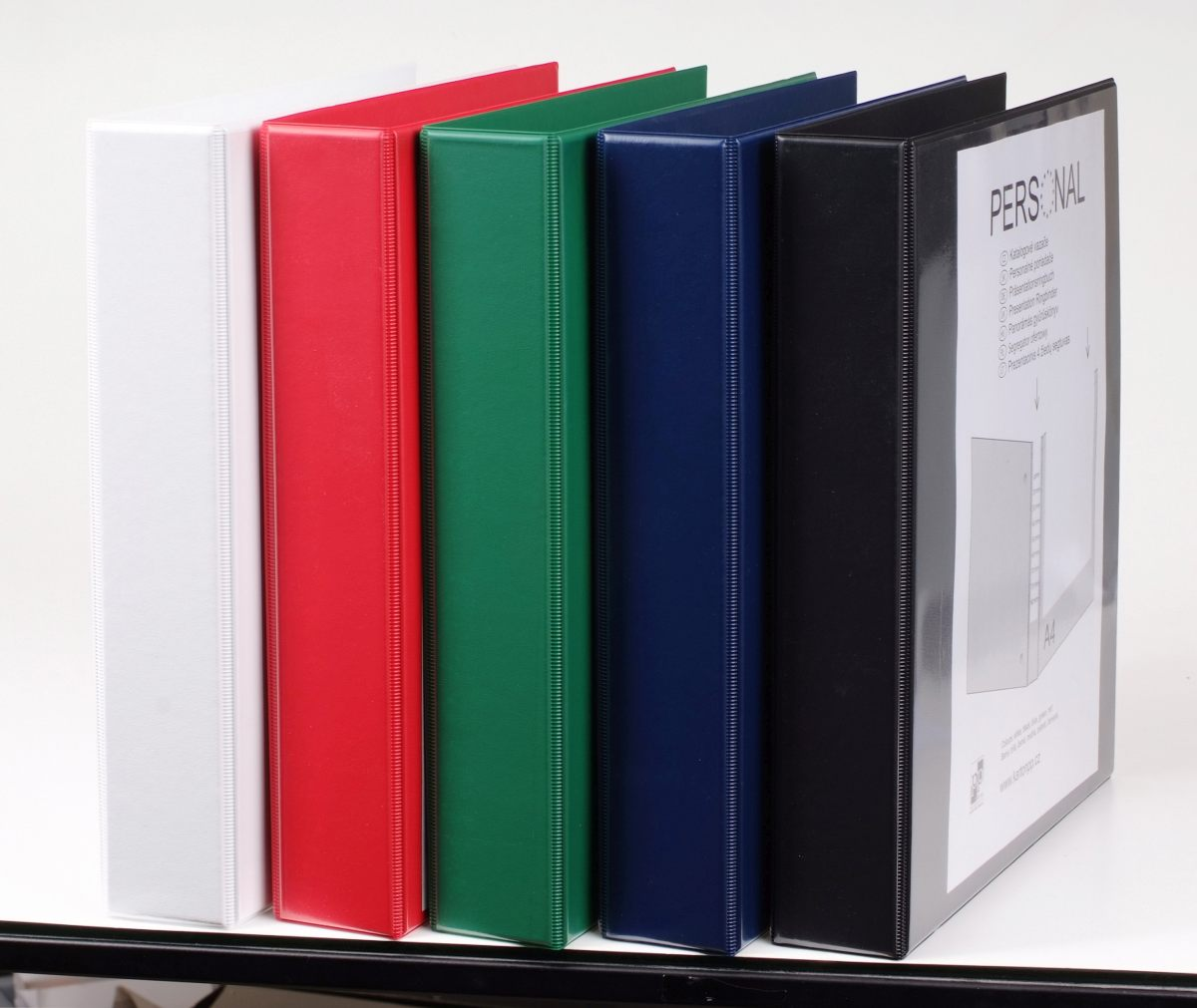 Zakládací pořadač s průhlednou kapsou na přední straně a hřbetu. 4 kroužková mechanika, kroužek má tvar písmene "D"