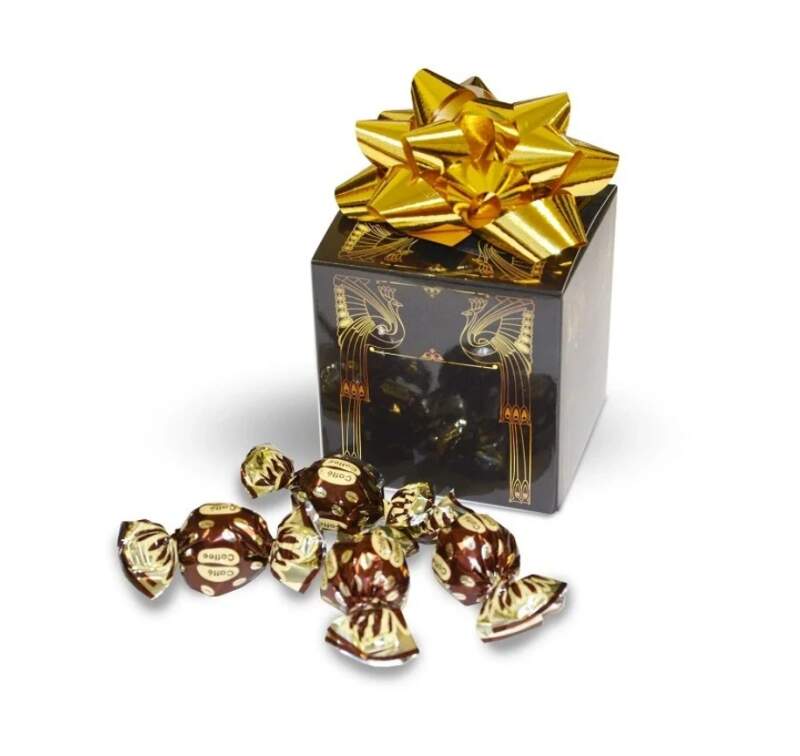 Kávové pralinky v dárkové krabičce s rozetou 210 g Pralinky z mléčné čokolády s kávovým krémem 210g. Složení: Náplň (60%): cukr, rostlinný tuk (palmový řepkový v různém poměru), odtučněný kakaový prášek 12%, sušená syrovátka, laktóza, odtučněné sušené mléko, káva (7%), emulgátor: sójový lecitin, vanilin, přírodní vanilkové aroma Skořápka (40%): cukr, plnotučné mléko 16,5%, kakaová hmota, kakaové máslo, sušená syrovátka, emulgátor: sójový lecitin, přírodní vanilkové aroma. Může obsahovat stopy ořechů a gluten. Vyrobeno v Itálii Může obsahovat stopy ořechů a vajec. Uchovávejte na suchém místě. Chraňte před teplem. Výživové údaje na 100 g energetická hodnota 2 308 kJ / 553 kcal tuky 33,3 g z toho nasycených 18,6 g sacharidy 56,7g z toho cukry 54,5g bílkoviny 4,8g sůl 0,52 g