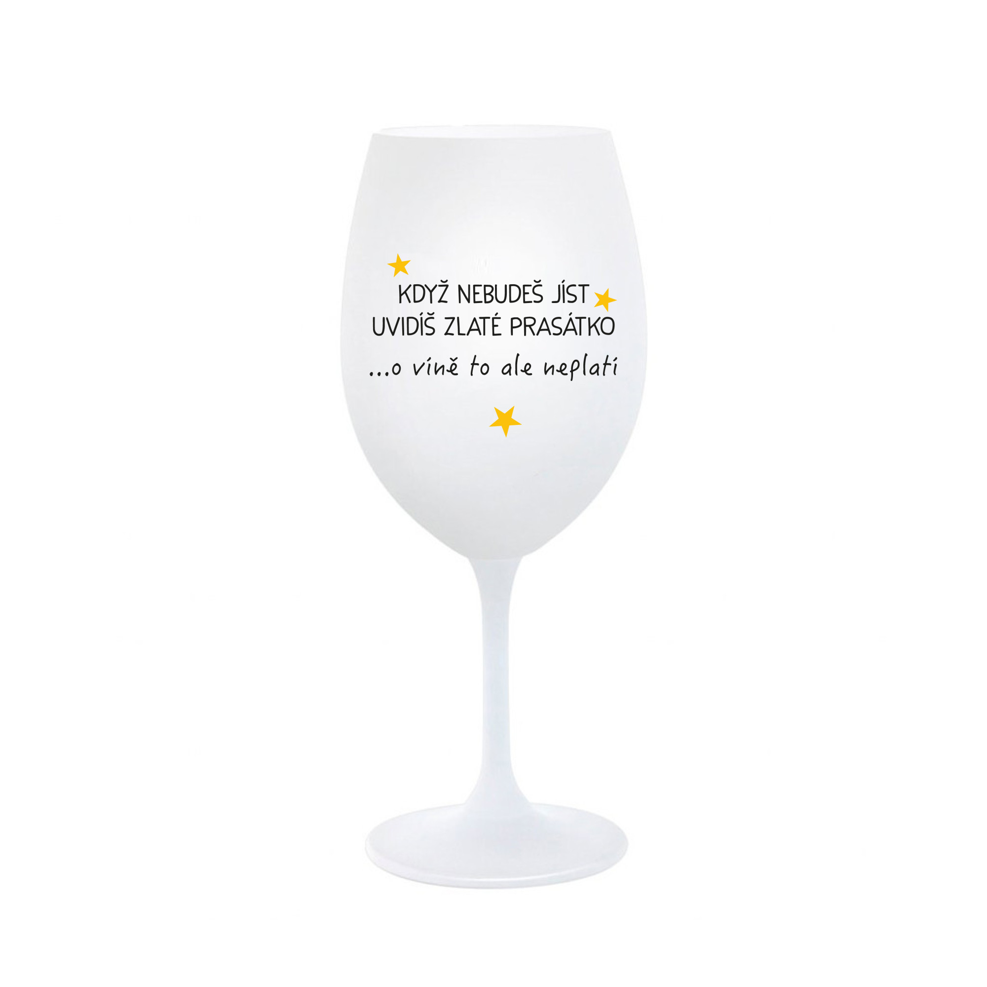 Vinná bílá sklenice s originálním motivem KDYŽ NEBUDEŠ JÍST, UVIDÍŠ ZLATÉ PRASÁTKO je krásným a osobitým dárkem, které ale využijete i Vy sami třeba ve chvílích, kdy si budete chtít zpříjemnit náročný den. Tyto originální vinné sklenice jsou totiž nejen pro výjimečné události, ale i pro běžné večery, které si chcete zpříjemnit sklenkou dobrého vína. Jistě proto potěší každého milovníka vína, i toho, kdo si umí svůj život vychutnat plnými doušky. Materiál sklo. Vyrobené s láskou v ČR