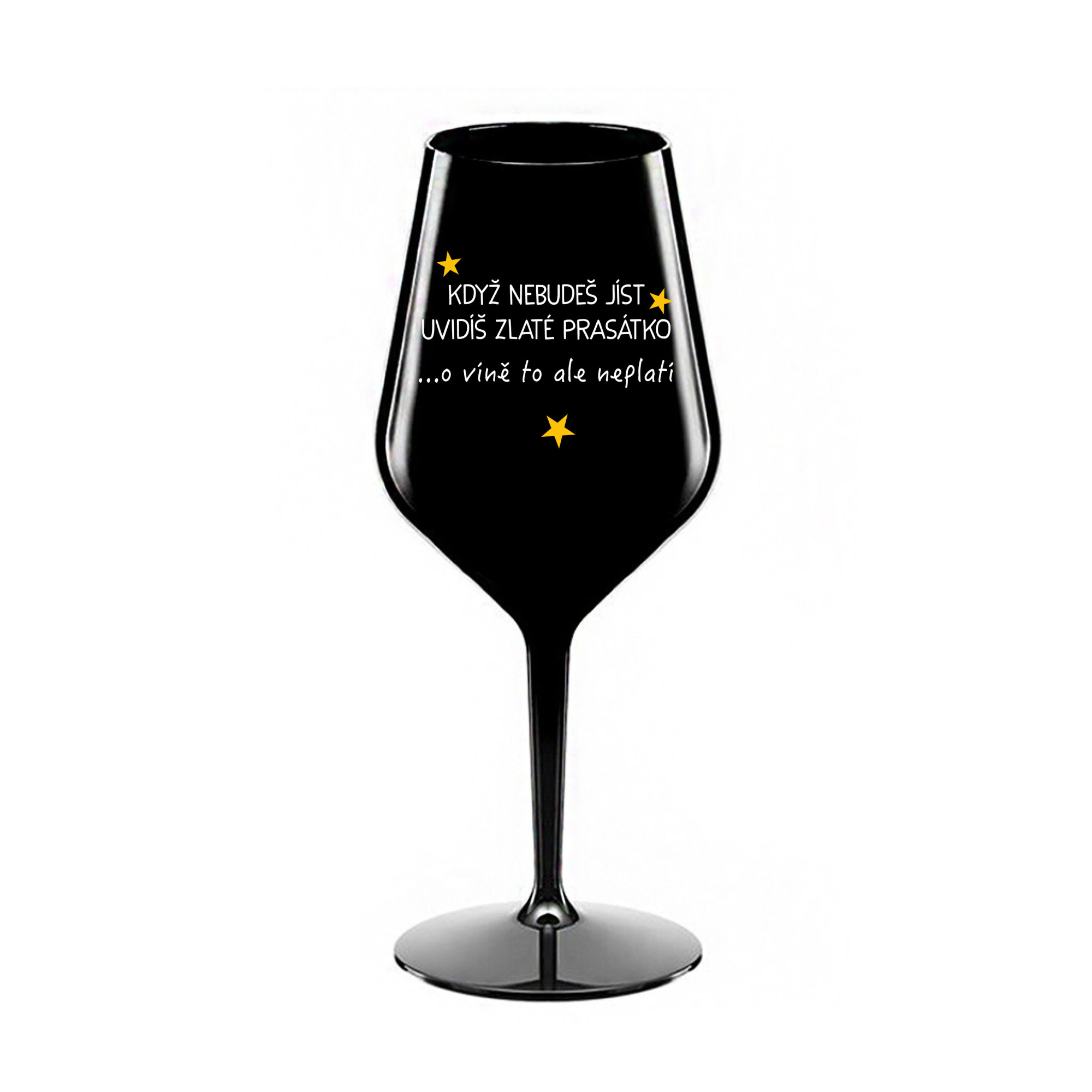 Nerozbitná černá vinná sklenice s motivem KDYŽ NEBUDEŠ JÍST, UVIDÍŠ ZLATÉ PRASÁTKO je skvělá na zahradu, pláž, výlet, piknik a parádu udělá i při kempování. Jelikož je vyrobená z kvalitního polykarbonátu je de facto nerozbitná. Je to luxusní kousek, s nímž si víno můžete vychutnat prostě kdekoliv. Mají ergonomický tvar, který příjemně padne do ruky a protože je lehká, usnadňuje to její přenášení. Je snadno skladovatelná a lehce se čistí. Díky svému designu si s ní můžete vychutnat doopravdy kdekoliv bezproblémové pití výborného vína. Materiál PP. Vyrobené s láskou v ČR