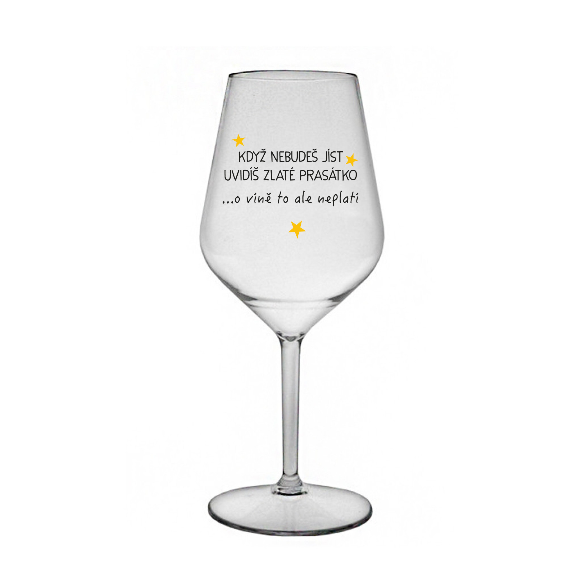 Nerozbitná čirá vinná sklenice s motivem KDYŽ NEBUDEŠ JÍST, UVIDÍŠ ZLATÉ PRASÁTKO je skvělá na zahradu, pláž, výlet, piknik a parádu udělá i při kempování. Jelikož je vyrobená z kvalitního polykarbonátu je de facto nerozbitná. Je to luxusní kousek, s nímž si víno můžete vychutnat prostě kdekoliv. Mají ergonomický tvar, který příjemně padne do ruky a protože je lehká, usnadňuje to její přenášení. Je snadno skladovatelná a lehce se čistí. Díky svému designu si s ní můžete vychutnat doopravdy kdekoliv bezproblémové pití výborného vína. Materiál PP. Vyrobené s láskou v ČR