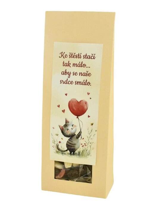 Směs ořechů a sušeného ovoce v dárkové krabičce s motivem roztomilého koťátka na rozkvetlé louce držícího v tlapkách obrovský červený balón ve tvaru srdce. Text: Ke štěstí stačí tak málo...aby se naše srdce smálo. Složení: jádra lískových ořechů, mandle loupané, papája, rozinky Alergeny: mandle, lískové ořechy, SO2 Může obsahovat stopy jiných skořápkových plodů. Skladujte v suchu, chladu a ve tmě. Po otevření skladujte v uzavřené nádobě nebo v sáčku, aby se zamezilo přístupu vzduchu. V případě volného uložení dojde k navlhnutí směsi.
