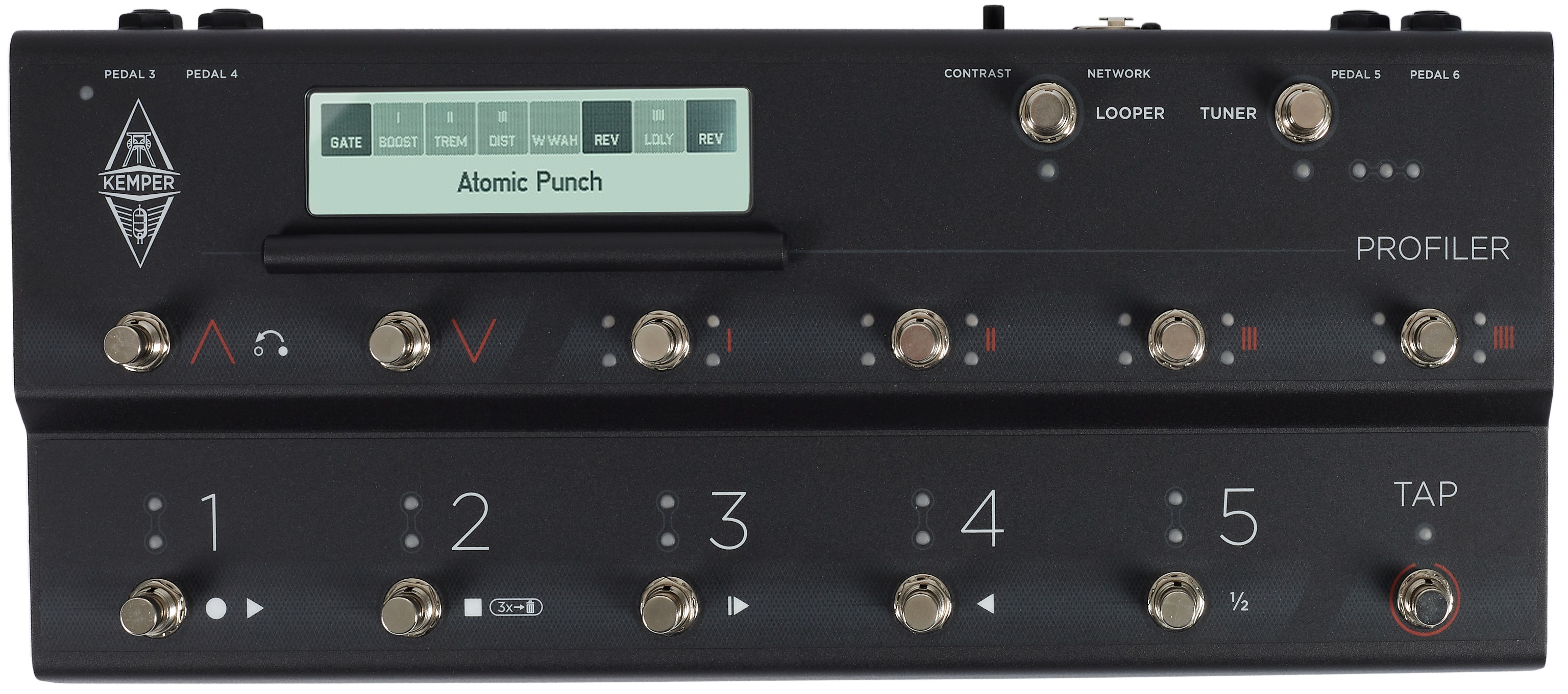 Speciální nožní přepínač Kemper Profiler Remote MK2 je speciální footswitch určený k ovládání zařízení z řady Profiler MK2. Jeho ovládací panel je osazen celkem 14 footswitchi, s jejichž pomocí můžete přepínat mezi režimy zařízení, volit mezi efekty, využít funkci integrované ladičky nebo nastavit vlastní Tap Tempo. K dispozici je také přepínač pro funkci Looper, která vám umožní nahrávat smyčky a vrstvit je na sebe – využít můžete až 120 vteřin nahrávacího času a všechny běžné loopingové f