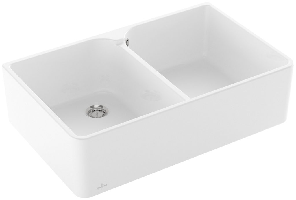 Keramický dřez modulový, bez excentru, dvě vaničky, barva Stone White, šířka 79,5 cmKeramický dřez Villeroy & Boch Farmhouse je vyroben z materiálu CeramicPlus, který zajišťuje vyjímečnou tvrdost, odolnost proti poškrábání nebo jinému poškození a také odolnost proti vysokým teplotám. Povrch je odolný proti cizím látkám a nečistotám, takže se výborně čistí a potraviny na něm nezanechávají žádné stopy. Materiál CeramicPlus je vyroben ze 100% přírodních materiálů, je barevně stálý a nepřijímá chutě ani zápachy, takže ja absolutně nezávadný pro potraviny. Materiál: keramika s úpravou CeramicPlus Barva: Stone White, bílá matná Dřez je určen pro montáž na spodní skříňku Zadní strana dřezu není glazovaná Doporučuje se montáž do pracovní desky s přírodního nebo umělého kamene, nebo z keramiky Obsahuje odpadovou sadu bez excentru (ruční ovládání výpusti), sítko na nečistoty a sadu pro montáž na skříňku Sifon není součástí dodávky (možno doobjednat pod označením 94060000) Rozměry dřezu (ŠxHxV): 795 x 500 x 220 mm Hloubka vaničky 200 mm Minimální šířka skříňky: 800 mm Hmotnost: 34,9 kg Do dřezu je možno z výroby připravit otvor č.1 dne nákresu Tento dřez se vyrábí v barvách White alpin, Stone White, Cream a Pure Black. Dřez s odpadovou sadou s excentrem je na poptávku.