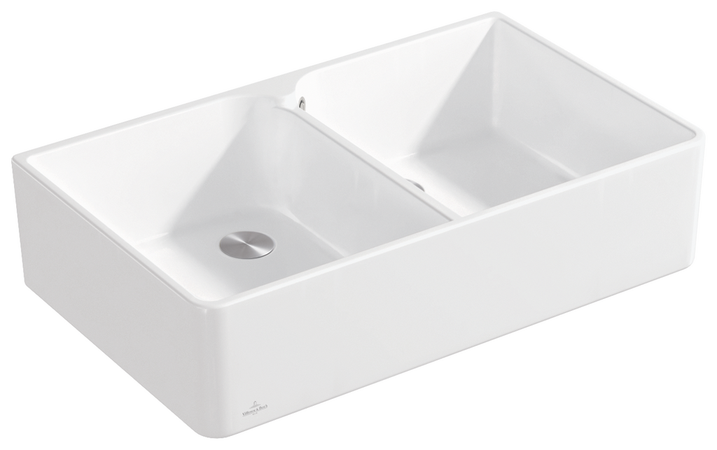 Keramický dřez modulový, bez excentru, dvě vaničky, barva White alpin, šířka 90 cmKeramický dřez Villeroy & Boch Farmhouse je vyroben z materiálu CeramicPlus, který zajišťuje vyjímečnou tvrdost, odolnost proti poškrábání nebo jinému poškození a také odolnost proti vysokým teplotám. Povrch je odolný proti cizím látkám a nečistotám, takže se výborně čistí a potraviny na něm nezanechávají žádné stopy. Materiál CeramicPlus je vyroben ze 100% přírodních materiálů, je barevně stálý a nepřijímá chutě ani zápachy, takže ja absolutně nezávadný pro potraviny. Materiál: keramika s úpravou CeramicPlus Barva: White alpin, bílá lesklá Dřez je určen pro montáž na spodní skříňku Zadní strana dřezu není glazovaná Doporučuje se montáž do pracovní desky s přírodního nebo umělého kamene, nebo z keramiky Obsahuje odpadovou sadu bez excentru (ruční ovládání výpusti), sítko na nečistoty a sadu pro montáž na skříňku Sifon není součástí dodávky (možno doobjednat pod označením 94060000) Rozměry dřezu (ŠxHxV): 905 x 550 x 220 mm Hloubka vaničky 200 mm Minimální šířka skříňky: 900 mm Hmotnost: 41,48 kg Do dřezu je možno z výroby připravit otvor č.1 dne nákresu Tento dřez se vyrábí v barvách White alpin, Stone White, Cream a Pure Black. Dřez s odpadovou sadou s excentrem je na poptávku.
