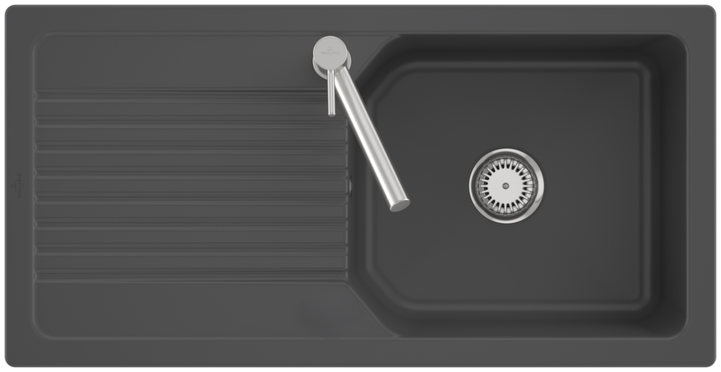 Keramický dřez pro horní montáž, bez excentru, barva Graphit, šířka 100 cmKeramický dřez Villeroy & Boch Linara je vyroben z materiálu CeramicPlus, který zajišťuje vyjímečnou tvrdost, odolnost proti poškrábání nebo jinému poškození a také odolnost proti vysokým teplotám. Povrch je odolný proti cizím látkám a nečistotám, takže se výborně čistí a potraviny na něm nezanechávají žádné stopy. Materiál CeramicPlus je vyroben ze 100% přírodních materiálů, je barevně stálý a nepřijímá chutě ani zápachy, takže ja absolutně nezávadný pro potraviny. Materiál: keramika s úpravou CeramicPlus Barva: Graphit, matná Dřez je určen pro horní montáž na pracovní desku Dřez je oboustranný - vanička může být napravo nebo nalevo Obsahuje odpadovou sadu bez excentru (ruční ovládání výpusti) a sítko na nečistoty Sifon není součástí dodávky (možno doobjednat pod označením 94060000) Rozměry dřezu (ŠxHxV): 1000 x 510 x 200 mm Rozměry výřezu (ŠxH): 970 x 480 mm Minimální šířka skříňky: 600 mm Hmotnost: 24 kg Při objednávce uvádějte číslo otvoru pro baterii - viz nákres Tento typ dřezu se vyrábí v barvách White alpin, Stone White, Cream, Ivory, Almond, Steam, Fossil, Stone, Graphite, Pure Black, Snow White, Timber, Chromite. Tento dřez s odpadovou sadou s excentrem je na poptávku.