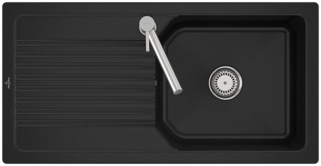 Keramický dřez pro horní montáž, bez excentru, barva Chromit, šířka 100 cmKeramický dřez Villeroy & Boch Linara je vyroben z materiálu CeramicPlus, který zajišťuje vyjímečnou tvrdost, odolnost proti poškrábání nebo jinému poškození a také odolnost proti vysokým teplotám. Povrch je odolný proti cizím látkám a nečistotám, takže se výborně čistí a potraviny na něm nezanechávají žádné stopy. Materiál CeramicPlus je vyroben ze 100% přírodních materiálů, je barevně stálý a nepřijímá chutě ani zápachy, takže ja absolutně nezávadný pro potraviny. Materiál: keramika s úpravou CeramicPlus Barva: Chromit, černá lesklá Dřez je určen pro horní montáž na pracovní desku Dřez je oboustranný - vanička může být napravo nebo nalevo Obsahuje odpadovou sadu bez excentru (ruční ovládání výpusti) a sítko na nečistoty Sifon není součástí dodávky (možno doobjednat pod označením 94060000) Rozměry dřezu (ŠxHxV): 1000 x 510 x 200 mm Rozměry výřezu (ŠxH): 970 x 480 mm Minimální šířka skříňky: 600 mm Hmotnost: 24 kg Při objednávce uvádějte číslo otvoru pro baterii - viz nákres Tento typ dřezu se vyrábí v barvách White alpin, Stone White, Cream, Ivory, Almond, Steam, Fossil, Stone, Graphite, Pure Black, Snow White, Timber, Chromite. Tento dřez s odpadovou sadou s excentrem je na poptávku.